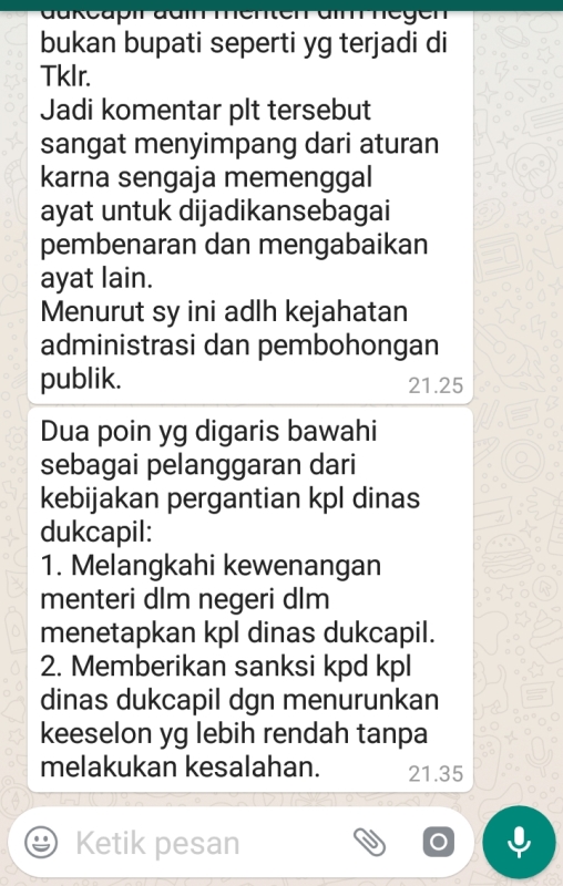 “Padahal Surat Edaran (SE) menteri Nomor B/50/M.SM.00.00/2019 tertanggal 28 Februari 2019, tentang petunjuk pelaksanaan penjatuhan Pemberhentian Tidak Dengan Hormat (PTDH) oleh PPK menyatakan bahwa apabila PPK tidak melaksanakan pemecatan hingga batas waktu 30 April 2019 maka ia akan dijatuhi sanksi administrasi sesuai pasal 81 ayat (2) huruf C UU Nomor 30 tahun 2014 tentang administrasi pemerintahan. Mahkamah Konstitusi pun turut mempertegas agar SKB tersebut dipatuhi,” papar Tolla sapaan akrab Imran AR Mursali.