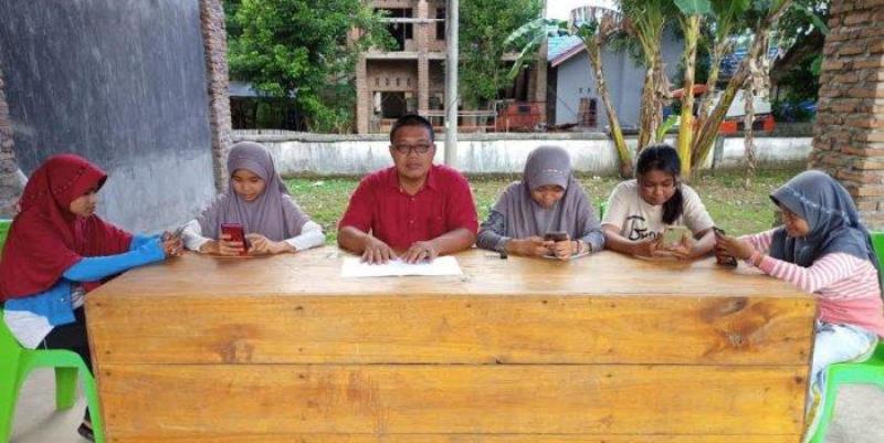 Kepala Desa Bontonyeleng, Andi Baso Mauragawali, bersama anak-anak desa belajar melalui daring memanfaatkan fasilitas Wifi gratis di Kantor Desa tersebut, Selasa (21/7/2020). (Foto : Ist)