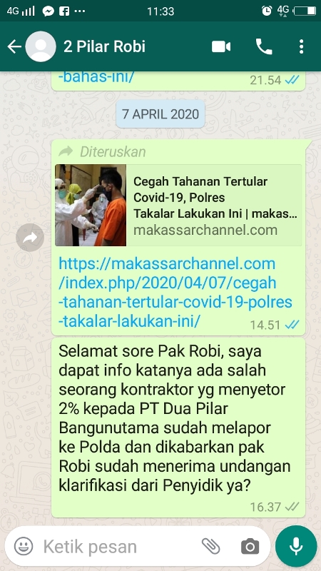 Di akhir penjelasannya, Muhlis minta MAKASSARCHANNELCOM mengkonfirmasi ke pimpinan Dua Pilar Bangunutama, Robi, terkait adanya panggilan klarifikasi dari penyidik Polda Sulsel. Namun hingga berita ditayangkan, pesan WhatSApp yang dikirim media ini ke nomor ponsel Robi, belum direspon. (kin)